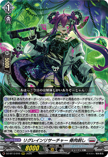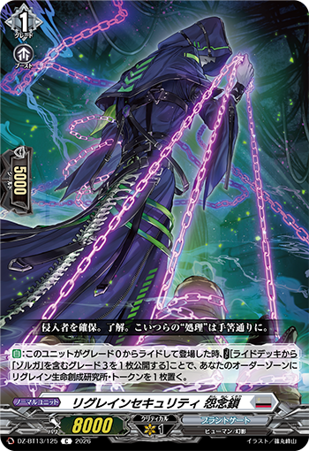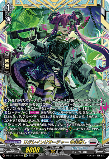 ※「禁忌の窮明者 ゾルガ “幻影”」「リグレインクリーチャー 黒涙の骸竜」「リグレインセキュリティ 怨念鎖」「リグレインリサーチャー 夢囓り」「ピアーシング・ラヴァー マーガレット」「リグレインリサーチャー 骨肉剥し」「創成魔獣 頭蓋絞り」「リグレインリサーチャー ヘンドリーナ」「創成魔獣 影食みの走狗」「創成魔獣 咬傷刻み」「リグレインリサーチャー 渦流探り」「リグレインセキュリティ 積怨砕き」「魔獣合成体 ユーバーメンシュ」「リグレイン生命創成研究所」は『どこヴァン!ねお』(第223回)にて紹介されました。